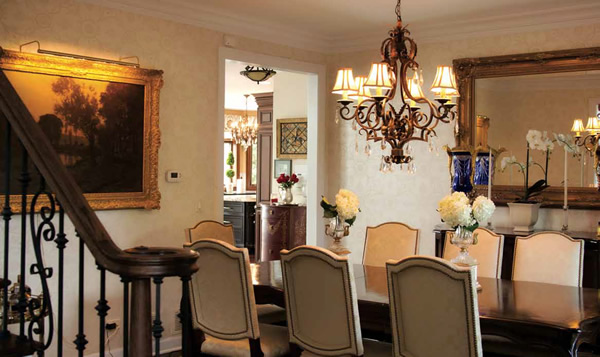 For the dining room, a French country table and set of chairs were chosen and a Schonbek chandelier was added for interest. Amy brought the painting that was a gift to her from a friend in L.A. The 19th century glass urns add a touch of elegance to the setting.