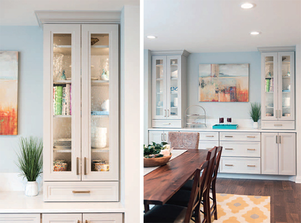 ABOVE RIGHT: The dining room hutch is the solution for the homeowners, who wanted a better use of the mirrored wall in their dining room. By opening up the kitchen into the dining room, they had to give up a wall of cabinetry, so the mirrored wall was a good place to look to for more storage and utility. We bumped new wall space out into the garage to maintain the same size of the dining room. Then, the newly built-in wall cabinet unit provided storage for items that wouldn’t fit in the kitchen, and offers a surface for displaying food or drinks at holiday parties or family get-togethers. It also serves as a focal point for artwork and a display of colorful china, as well as a nice backdrop for their brand-new walnut table.