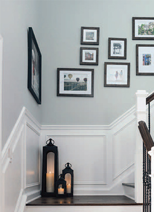 RIGHT: A redesigned staircase with new paneling and fresh, updated wrought iron railings came in later as the construction work started revealing the new face of the home, and that the old stair case was going to stand out even more as quite dated with its heavy wood railing design. The contemporary style reflects current trends and the iron wrought railings are an attractive design choice. The new paneling, although more traditional in its look, brightens up the walls and gives the whole entryway a very sophisticated and crisp look.