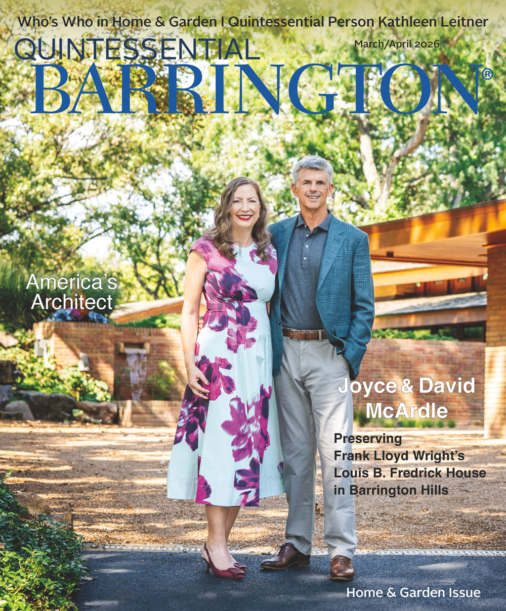 ON THE COVER: After three years of research and restoration of their second Frank Lloyd Wright home, the Louis B. Fredrick house in Barrington Hills, Joyce and David McArdle applied for and received the news that their home had been accepted into the National Register of Historic Places. The first Wright home they lived in was the 1901 F. B. Henderson house in Elmhurst. Living in these works of art has shaped the couple’s sense of light, patterns, and the rhythms of life and like the home itself, reinforces a holistic integration between man and nature.