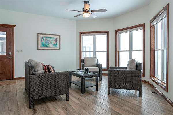 The home was built on land that was owned by a man from Bill’s hometown of Deerfield, who lives up the hill in his original house. The couple hired an architect from Middleton, Wisconsin, whom they met at a Schaumburg lake and cabin show. The builder, a family whose name is Kinney, included local Amish cabinet makers for the project’s woodworking needs.