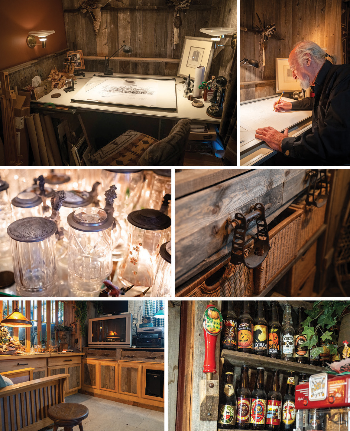 In restoration and decoration, Powers has taken a few design liberties that nod to modernity, such as some retro telephones and a beer bottle collection, but kept the spirit of the 1800s alive using wood paneling, and accents that reflect the early prairie days, as well as some Western motifs. He’s used his skill as a one-time carpenter to make detailed elements like the prairie-style lighting fixtures in the kitchen and picture frames. His drawing studio is a small closet-like space fitted with a drawing table and art supplies. The drawing in the photo (last page) is of the Johnson/Krol home. His pen and ink art is exquisite.