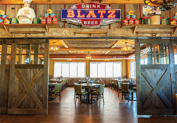 An array of Barrington sports memorabilia such as helmets and photos are featured throughout the main bar, along with plenty of TVs for sports and music video fans. The main bar is reserved for adults and is set apart from the main dining area. Interior design elements feature walls made of hand-cut and assembled reclaimed woods, as well as hand-cut whiskey barrel staves creating a contemporary rustic theme.