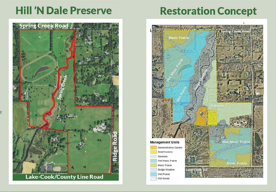 The nearly 250-acre site will be named Hill ‘N Dale Preserve and encompasses 4,060 linear feet of the high-quality Spring Creek, a tributary to the Fox River. The preserve honors the current name of the Duchossois property and reflects the protection of the surrounding upland bluffs (Hill) and the Spring Creek valley (Dale). The land has been identified as a priority for protection and restoration in multiple local and regional plans, including the Barrington Greenway Initiative, the Spring Creek Watershed-Based Plan, and McHenry and Lake County Green Infrastructure Plans. It will provide green space connectivity to numerous other protected lands in our area, including the 4,000-acre Spring Lake (Spring Creek) Forest Preserve and the 550-acre state dedicated Spring Lake Nature Preserve.